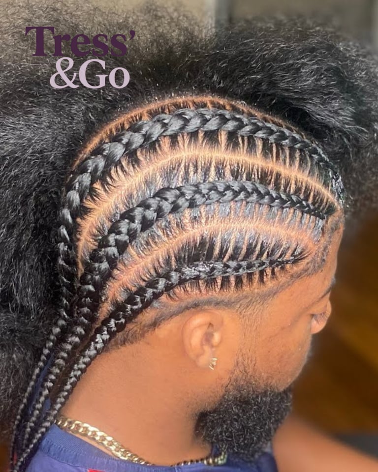 Hommes : cornrows, zigzag, deux lignes plaquées, box braids courtes.